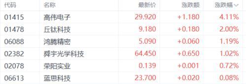 苹果概念股上涨,高伟电子涨超4%,丘钛科技、鸿腾精密、舜宇光学科技、蓝思科技等跟涨。