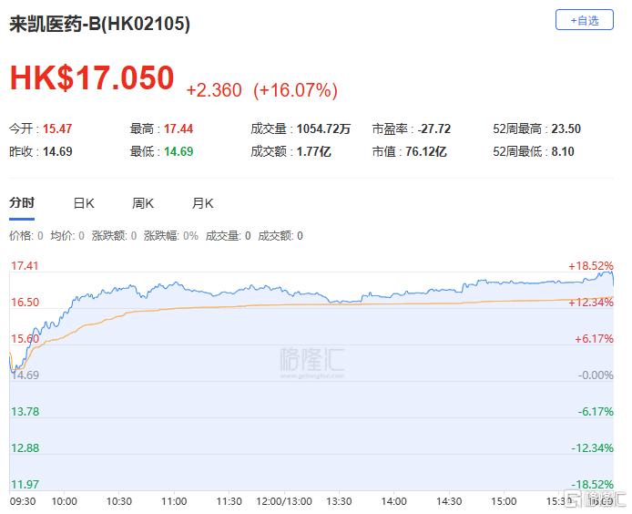 来凯医药-B大涨超16%,报17.05港元,创逾一个月新高。