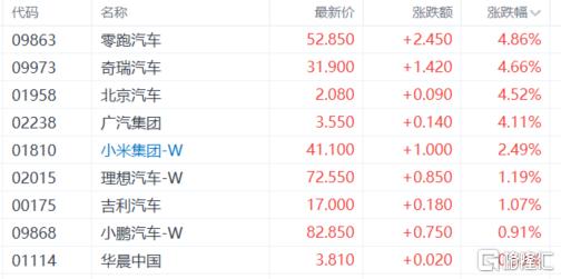 新能源车企股走高,零跑汽车、奇瑞汽车、北京汽车、广汽集团涨超4%,小米集团-W等跟涨。
