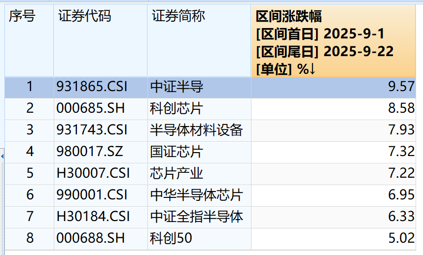 而且中证半导在半导体设备、材料和芯片设计三个环节的布局超过90%,是主流半导体指数中明显更聚焦半导体上中游的选择,9月以来涨幅在几个半导体指数中位列第一,弹性非常好。