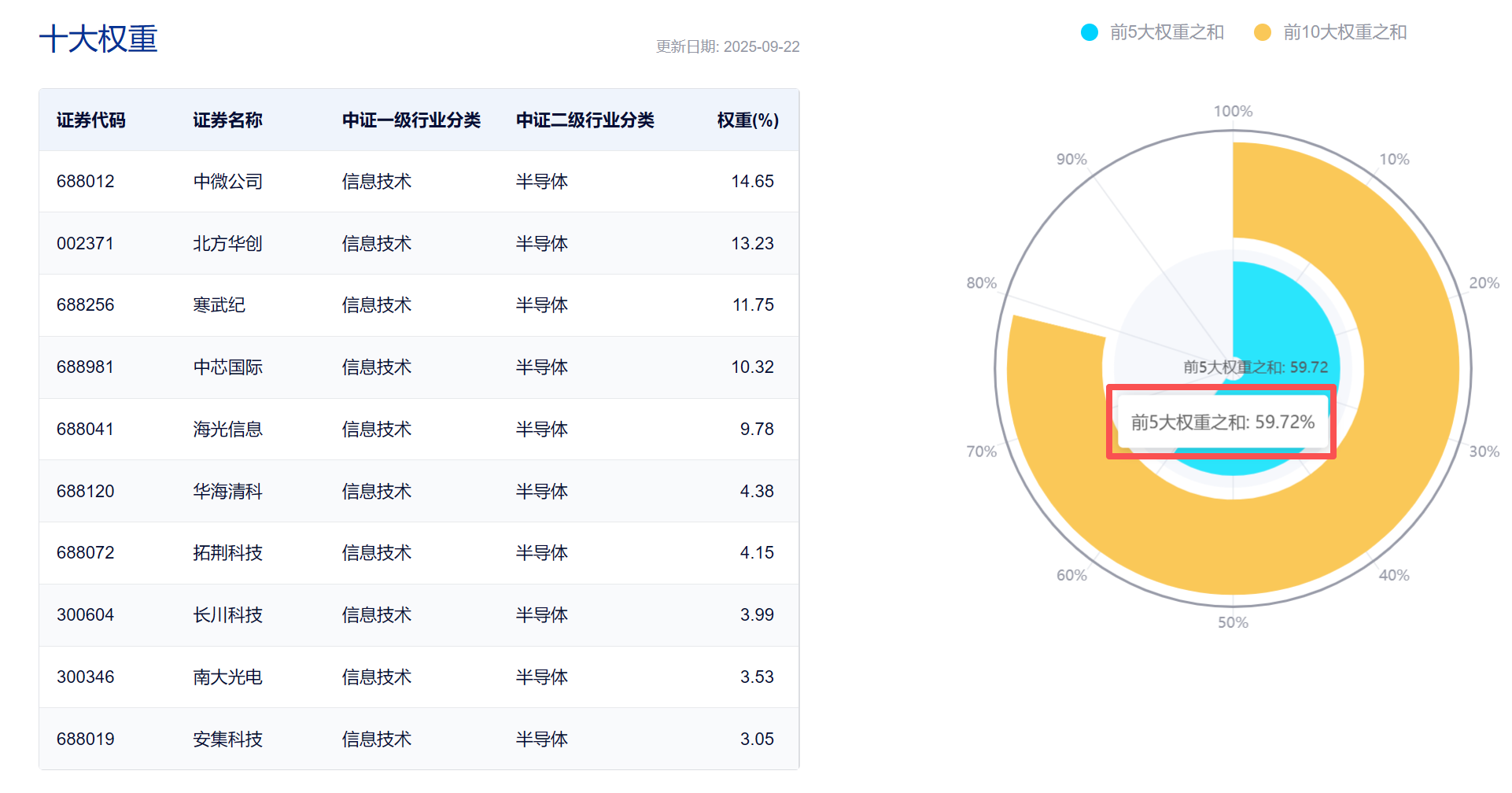 半导体设备ETF(561980)北方华创、中微公司、寒武纪、海光信息、中芯国际这些产业链龙头,前五大集中度高达60%,完美跟上国产替代的节奏。