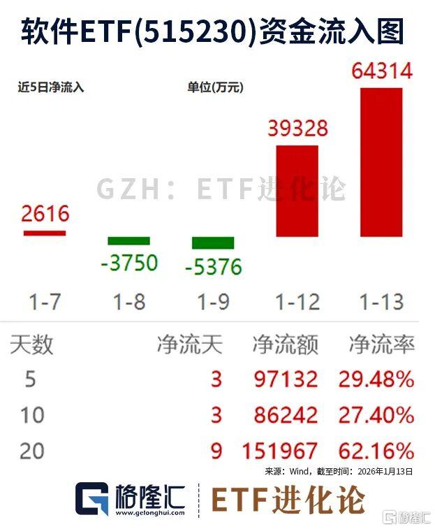 软件ETF(515230)标的指数今日上演V型走势,最终放量收涨3.89%,开年8个交易日涨21.8%。
