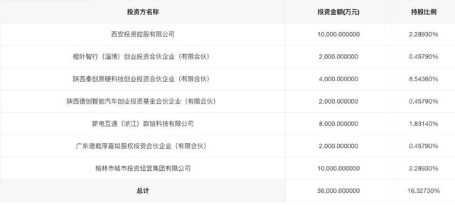 本轮增资,投资金额最大的两家机构分别为西安投资控股有限公司和榆林市城市投资经营集团有限公司,投资金额均为1亿元。