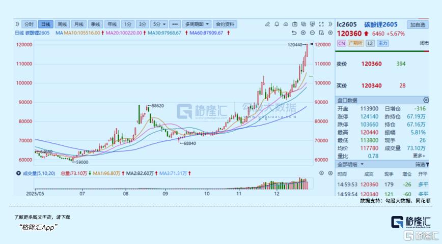 今天,碳酸锂期货主力合约也强势大涨5.96%,价格突破至12万元/吨,重回2024年3月时的高点,成为拉涨锂电概念的强大助推力。