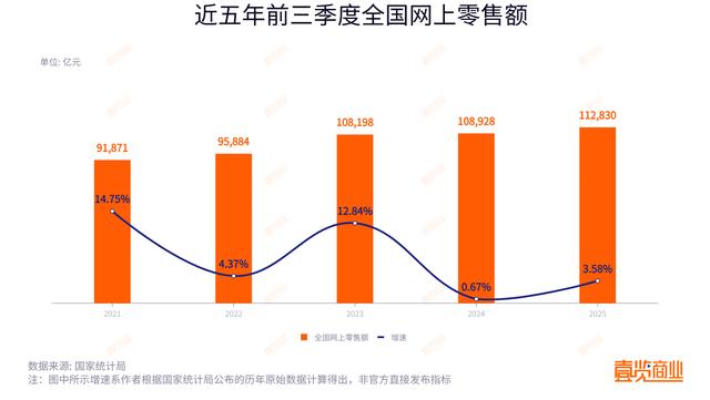 线上增速进入低增长新常态。国家统计局数据显示,全国网上零售额增速从2021年前三季度的14.75%一路下滑,2024年前三季度在零增长区间徘徊,尽管2025年前三季度小幅反弹至3.58%,但已进入个位数增长时代。