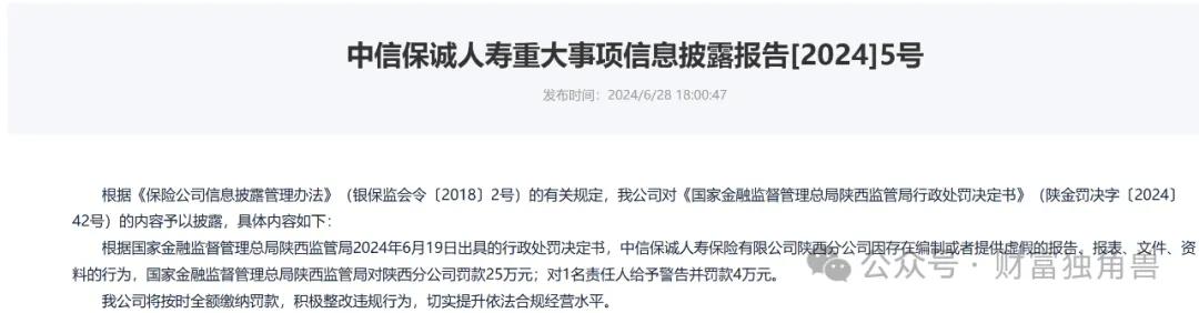 2022年,中国银保监会网站发布了年内第一张行政处罚决定书,罚单显示,中信保诚人寿向投保人、被保险人、受益人提供保险合同约定以外的其他利益,被罚款30万元;2024年2月,中信保诚人寿安徽省分公司因存在未按规定对保险代理人进行后续教育、执业登记信息不真实的行为,被给予警告并罚款2万元;2024年6月,中信保诚人寿陕西分公司因存在编制或者提供虚假的报告、报表、文件、资料的行为,被罚款25万元。