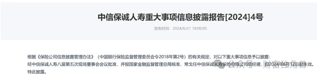 除了董事长一职外,2024年中信保诚人寿总经理也完成换届。2024年4月,中信保诚人寿前总经理赵小凡退休,董事会批准常戈出任中信保诚人寿临时负责人,2个月后,中信保诚人寿发布公告称,经董事会会议批准,并报国家金融监督管理总局核准,常戈任中信保诚人寿总经理。值得一提的是,2024年11月据中央纪委国家监委驻中信集团纪检监察组、河北省纪委监委消息,中信保诚人寿原党委书记、总经理赵小凡涉嫌严重违纪违法,目前正接受中央纪委国家监委驻中信集团纪检监察组和河北省监察委员会纪律审查和监察调查。