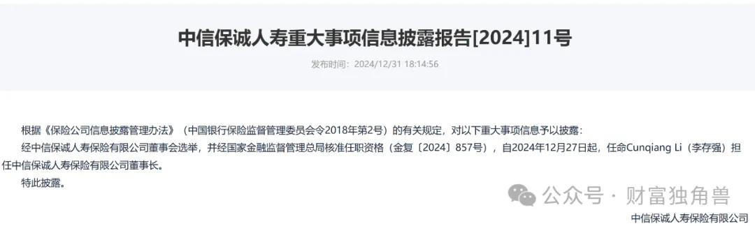 2024年12月31日,中信保诚人寿发布公告称,经董事会选举,并经国家金融监督管理总局核准,自2024年12月27日起,李存强正式担任董事长。此前2023年5月,中信保诚人寿原董事长黎康忠因个人原因递交辞呈。
