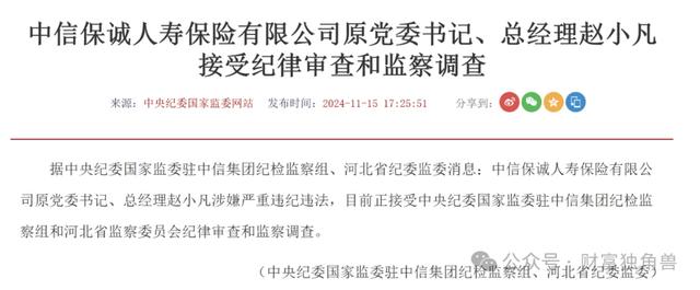 2024年11月,据中央纪委国家监委驻中信集团纪检监察组、河北省纪委监委消息,中信保诚人寿原党委书记、总经理赵小凡涉嫌严重违纪违法,目前正接受中央纪委国家监委驻中信集团纪检监察组和河北省监察委员会纪律审查和监察调查。