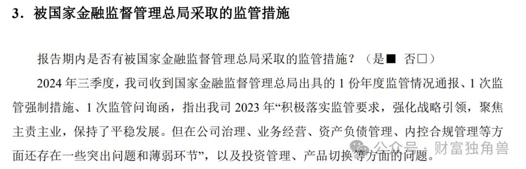 2024年三季度,中信保诚人寿收到国家金融监督管理总局出具的1份年度监管情况通报、1次监管强制措施、1次监管问询函,指出其在公司治理、业务经营、资产负债管理、内控合规管理等方面还存在一些突出问题和薄弱环节,以及投资管理、产品切换等方面的问题。