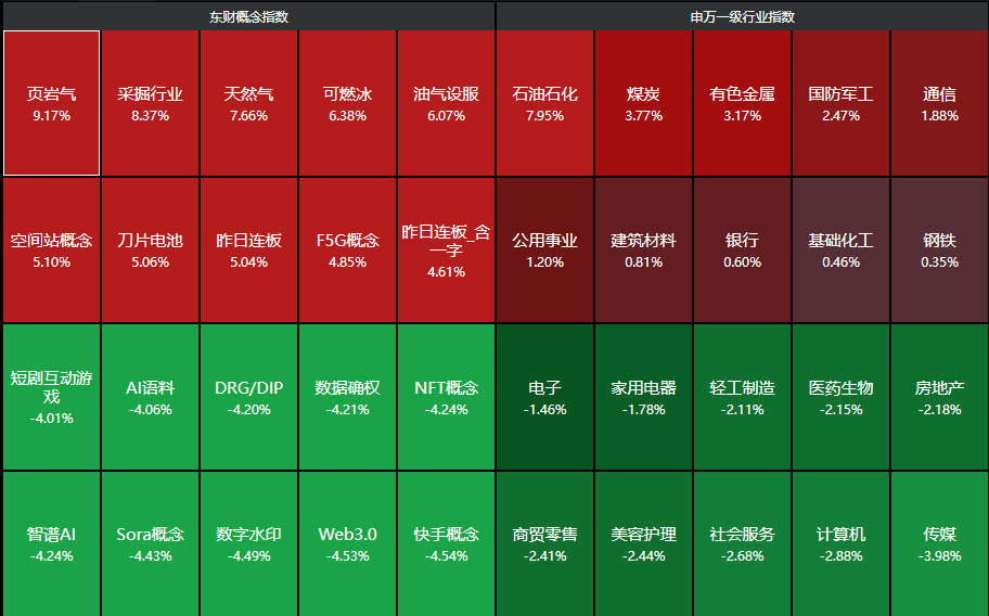 分行业来看,石油石化、煤炭、有色金属、国防军工、通信等行业领涨,传媒、计算机、社会服务、美容护理等行业领跌。
