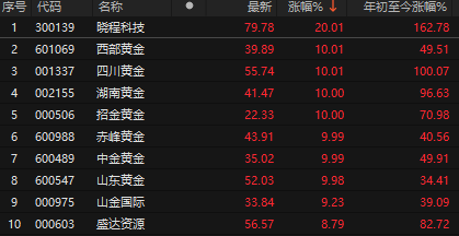贵金属板块也是掀起涨停潮,晓程科技、西部黄金、四川黄金、湖南黄金、赤峰黄金等多股涨停。