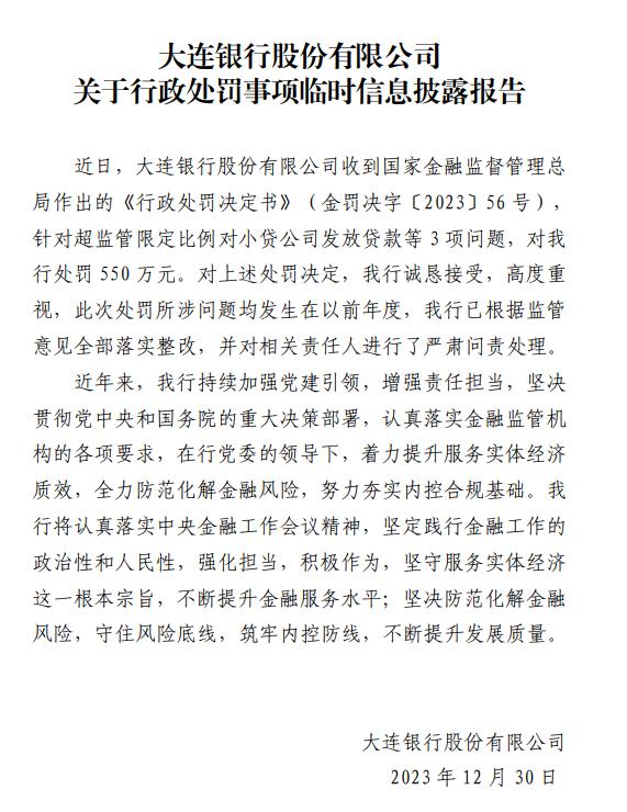 中新经纬2023年12月29日报道,国家金融监督管理总局作出的《行政处罚决定书》(金罚决字〔2023〕56号)显示,大连银行因“一、超监管限定比例对小贷公司发放贷款;二、违规为房地产项目提供融资;三、虚假整改,购买银行虚假理财并以复杂交易结构实现不良资产二次虚假出表”,金融监管总局对大连银行罚款550万元。