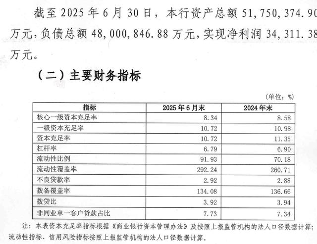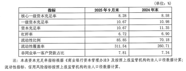 资本充足性方面,截至2025年6月末,该行核心一级资本充足率为8.34%,一级资本充足率为10.72%,资本充足率同样为10.72%。截至2025年9月末,其核心一级资本充足率降至约8.28%,一级资本和总体资本充足率均为10.67%,虽然仍高于监管最低要求,但核心一级资本充足率较6月末略有下降,或意味着资本缓冲空间有所收紧。