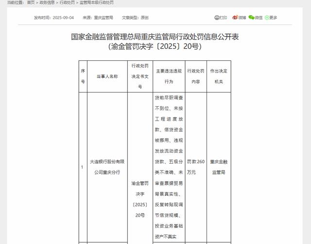 2025年,风险管理薄弱的信号继续出现。2025年9月4日,国家金融监督管理总局重庆监管局行政处罚信息公开表(渝金管罚决字〔2025〕20号)显示,大连银行股份有限公司重庆分行,因“贷前尽职调查不到位、未按工程进度放款、信贷资金被挪用、违规发放流动资金贷款、五级分类不准确、未审查票据贸易背景真实性、反复转贴现调节信贷规模、投资业务基础资产不真实”,重庆金融监管局对其罚款260万元。