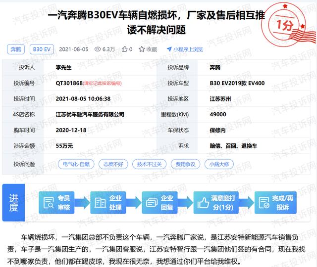 另外,一汽奔腾4S店的售后服务质量也未能达到其宣称的高标准。此前曾有奔腾B30 EV车主求助媒体,称自己的车辆在发生自燃并造成财产损失后,却遇到了厂家、售后相互推诿责任的情况,问题迟迟得不到妥善解决。