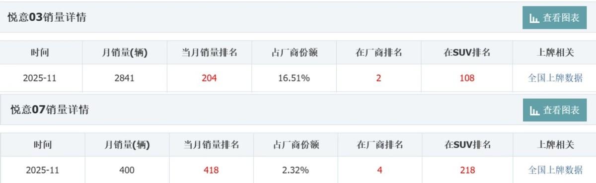 而被一汽奔腾寄予厚望,定位“千家万户都买得起的高品质新能源汽车”的“悦意”双子星表现平平。悦意03在2025年11月的销售量为2841辆,5月面世的悦意07更是仅售出400辆,无法为该公司提供高价值支撑。
