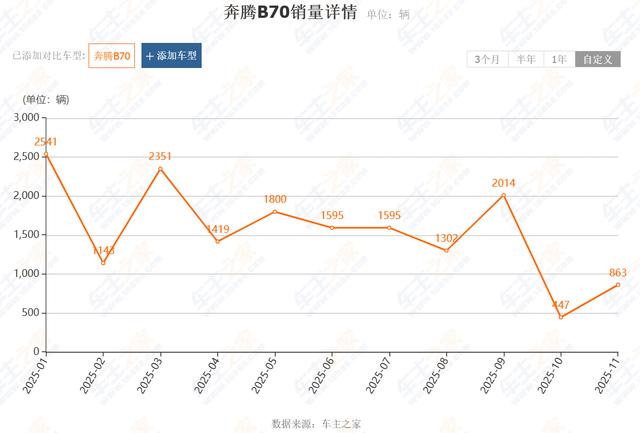 只不过,受到近年来新能源汽车全面崛起的冲击,一汽奔腾B702024年的累计销量已降至39277辆;2025年11月奔腾B70的单月销量仅863辆,前11月累计销量约1.7万辆,昔日的“当家花旦”正逐步丧失市场优势。