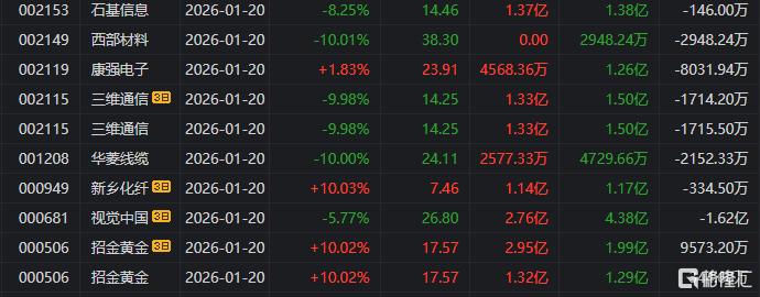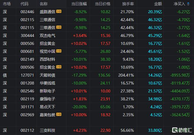 龙虎榜单日净卖出额前三为三维通信、双杰电气、招金黄金,分别为4.7亿元、1.64亿元、1.61亿元。