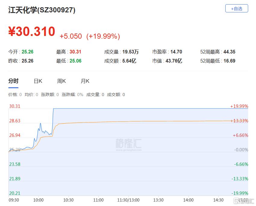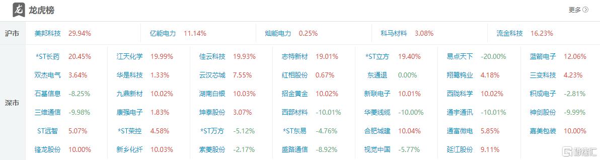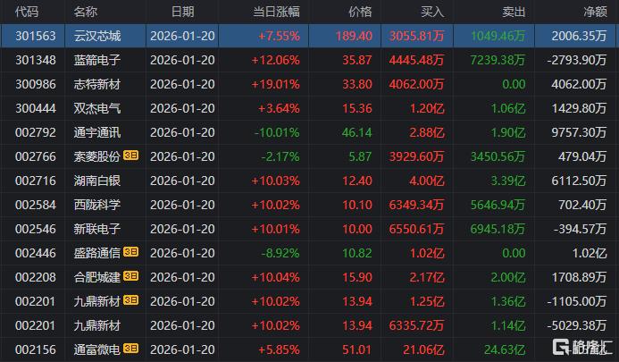 龙虎榜单日净买入额前三为湖南白银、佳云科技、江天化学,分别为1.26亿元、1.23亿元、1.23亿元。