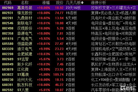 高位股方面,实控人变更的嘉美包装23天16板、锋龙股份15连板,智能电网板块森源电气、汉缆股份、广电电气均3连板。