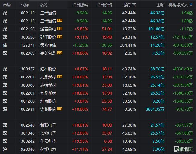 龙虎榜中涉及机构专用席位的个股中,当日净卖出额前三为三维通信、红相股份、志特新材,分别为1.94亿元、4036.4万元、2079.54万元。