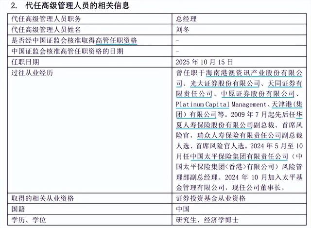 2025年10月16日,太平基金发布高级管理人员变更公告,宣布总经理曹琦、副总经理邓先虎因工作调整于10月15日卸任,两人均不转任公司其他岗位。值得一提的是,太平基金董事长刘冬暂代总经理一职。