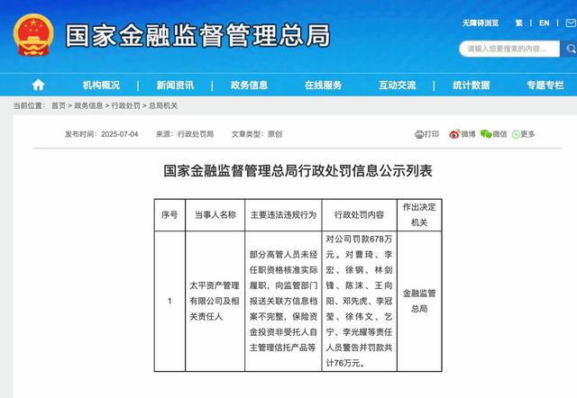从监管层面观察,2025年7月国家金融监督管理总局对太平资产的处罚决定与此次高管变动存在明显关联。罚单显示,太平资产因“部分高管人员未经任职资格核准实际履职,向监管部门报送关联方信息档案不完整,保险资金投资非受托人自主管理信托产品”等多项违规行为被处以678万元罚款。曹琦、邓先虎等11名责任人员对违规行为负有直接责任,被予以警告并处以罚款。