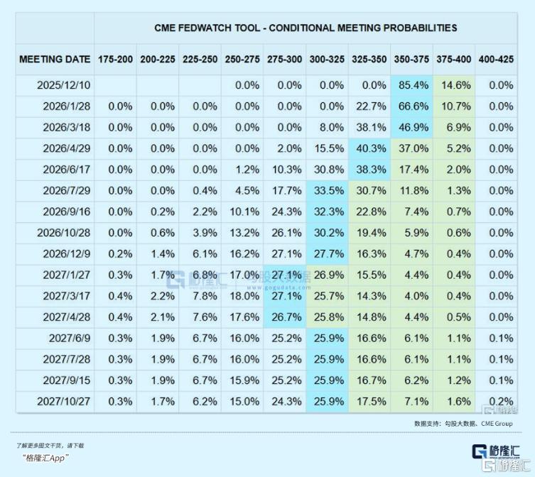 据CME“美联储观察”:美联储12月降息25个基点的概率为85.4%,高于上周的50%。美联储到明年1月累计降息25个基点的概率为66.6%,维持利率不变的概率为10.7%,累计降息50个基点的概率为22.7%。