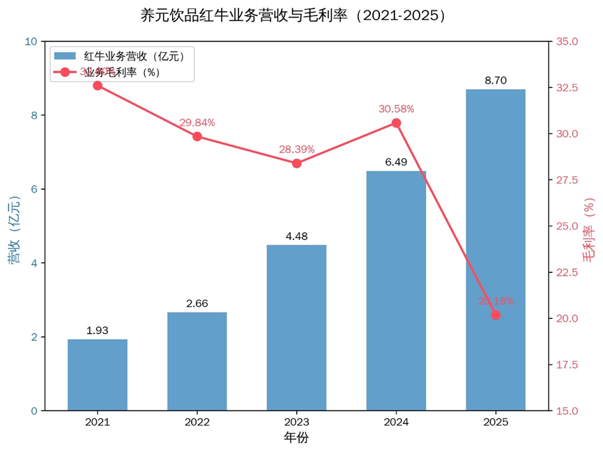 养元饮品代理的红牛业务,营收从2021年的1.93亿元增长至2025年的8.7亿元,5年规模扩张超4倍,成为养元饮品主业承压下的核心增量板块。但业务毛利率却并不稳定2021-2023年持续回落,2024年短暂修复至30.58%后,2025年骤降至20.18%,创下合作以来的历史新低,暴露出代理模式下规模扩张与盈利质量背离的增收不增利困境。