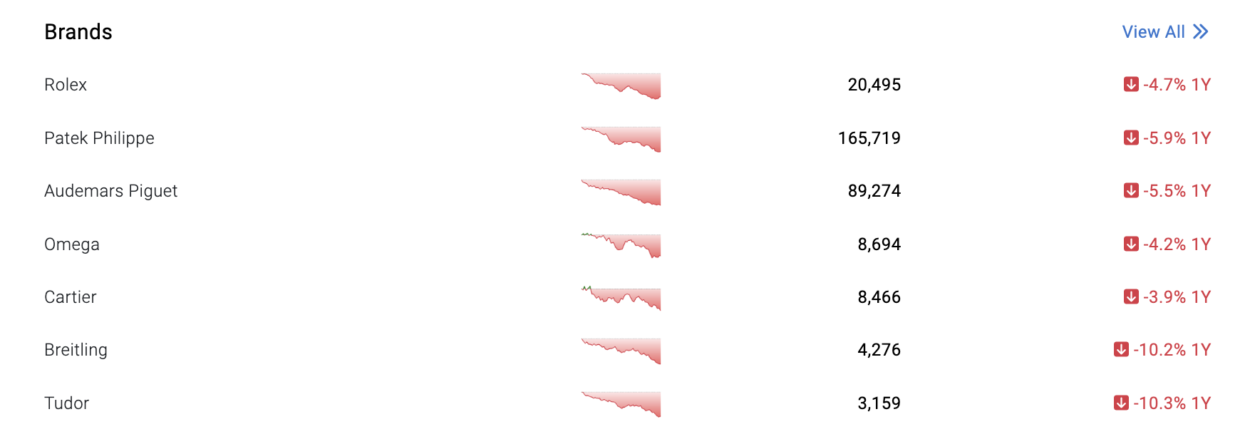 二手行情下跌的不止是劳力士。WatchCharts数据显示,百达翡丽、爱彼、欧米茄、帝舵等品牌腕表的二手市场价格下降5.5-10.3%不等。