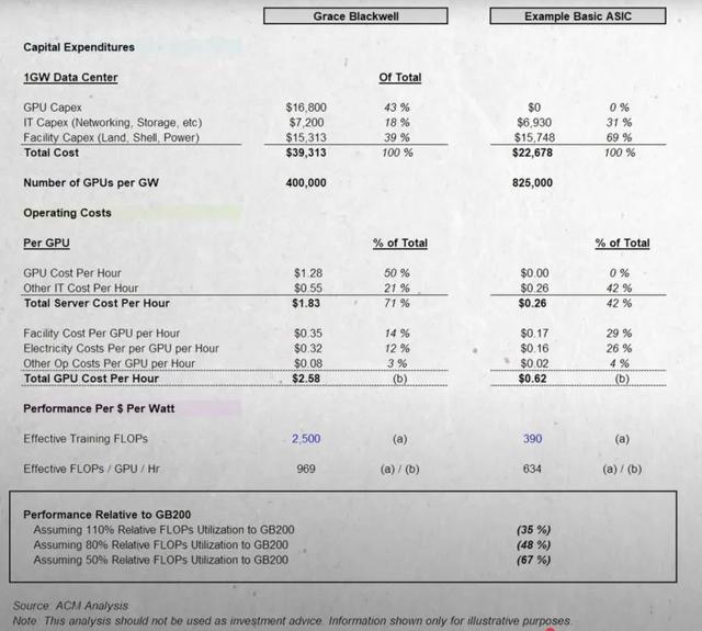 就算我们把Hopper和别人的ASIC看作同级,Blackwell也有30×的空间。所以在同一个GW上,你要放弃30×的营收。这代价太大了。就算对方白送芯片,你也只有2GW的电力可用,你的机会成本高得离谱——你永远会选择“单位能耗”最强的那套系统。