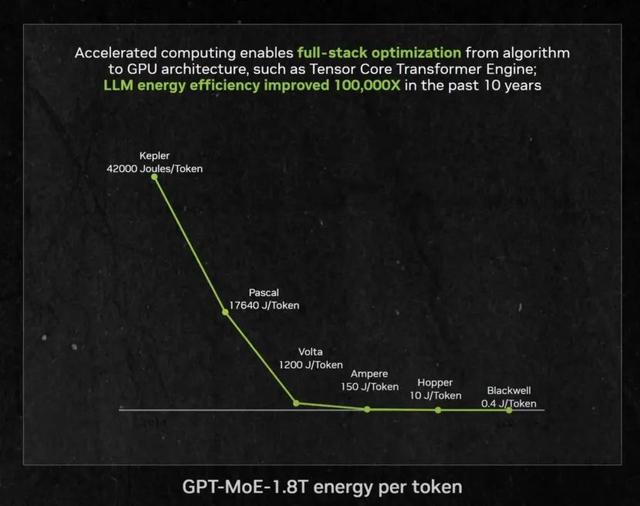 比如从Kepler(注:2012年4月发布)一路到Hopper(注:2022年3月发布),大概实现了100000的提升。那是英伟达 AI旅程的开端,十年十万倍。Hopper到Blackwell,因为NVLink等,我们在一年内实现了30×的系统级提升;接下来Rubin还会再来一波“x”(数倍),Feynman再一波“×”……