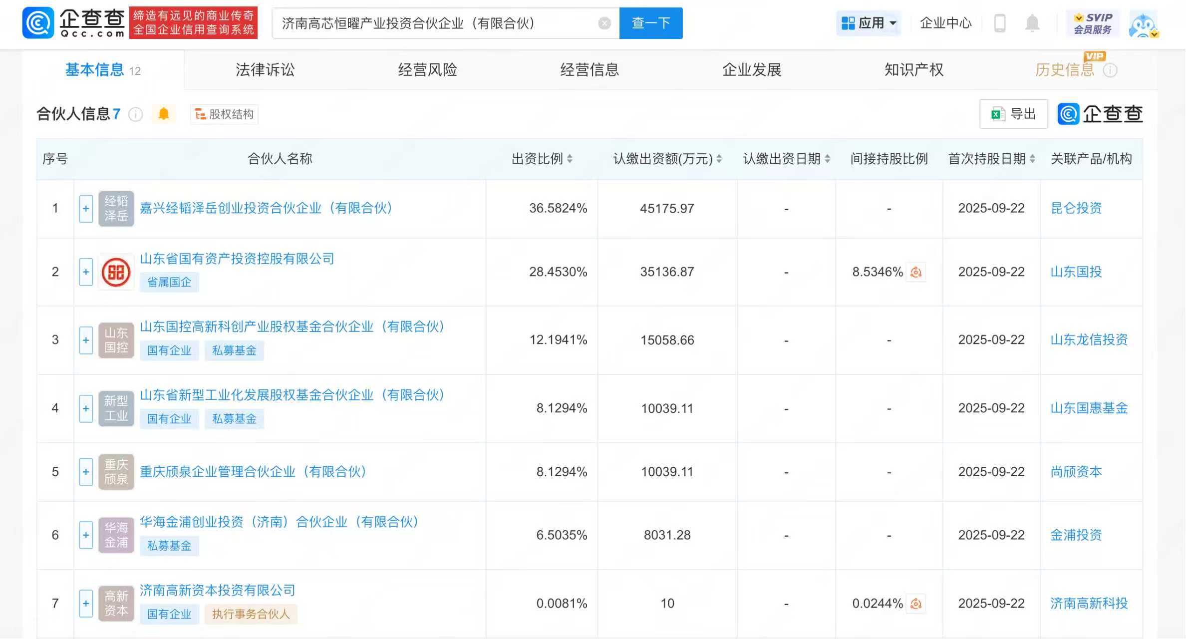 企查查APP显示,近日,济南高芯恒曜产业投资合伙企业(有限合伙)成立,执行事务合伙人为济南高新资本投资有限公司,出资额约12.35亿人民币,经营范围为以自有资金从事投资活动。企查查股权穿透显示,该合伙企业由嘉兴经韬泽岳创业投资合伙企业(有限合伙)、山东省国有资产投资控股有限公司、山东国控高新科创产业股权基金合伙企业(有限合伙)等共同出资。