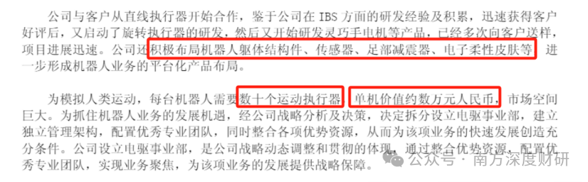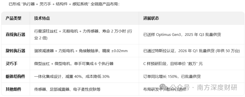 作为公司战略级业务,拓普集团专门拆分设立电驱事业部攻坚具身智能领域。其发展路径清晰可循:从直线执行器切入,逐步拓展至旋转执行器、灵巧手电机等核心部件,目前已实现“执行器+灵巧手+结构件+感知系统”的全链路覆盖。