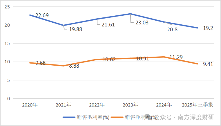 而2022年至2024年,公司归母净利率在呈现持续上行趋势,体现了公司有效的费用管控,但2025年三季报,公司毛利率降至六年最低点(19.2%),净利率也回落至9.41%,接近2020年水平。