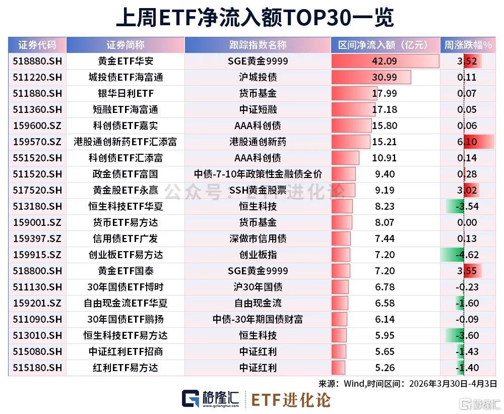 国内资金则是继续买入黄金ETF,黄金ETF华安、黄金股ETF永赢和黄金ETF国泰上周分别净流入42亿元、9亿元和7亿元。