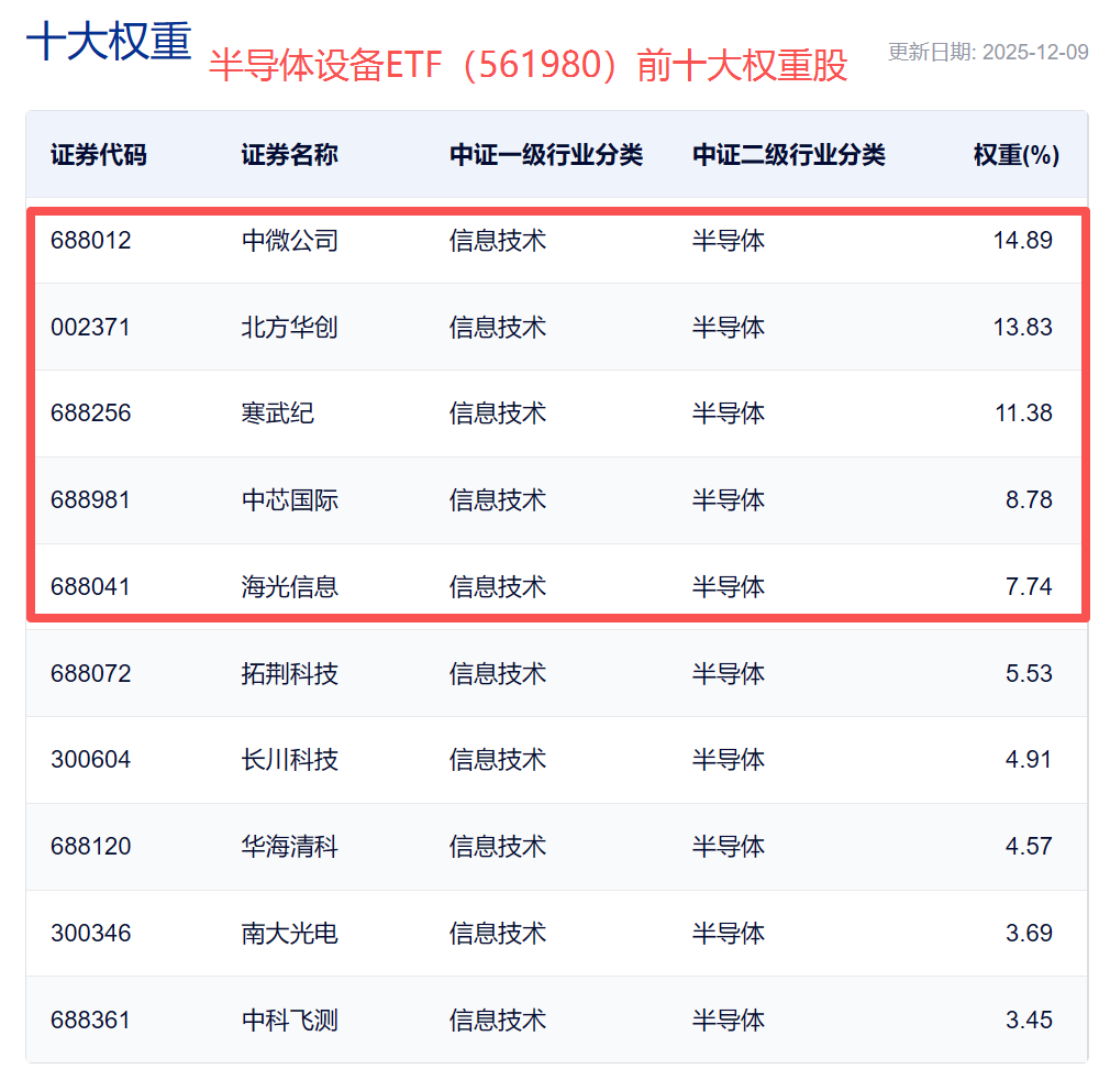 数据显示,截至12月9日,中证半导2025年年内涨幅为56.72%,区间最大上涨超80%,在中华半导体芯片、国证芯片、芯片产业等主流半导体指数中位列第一。据了解,该指数前十大均为中微公司、北方华创、寒武纪、中芯国际、海光信息等细分产业链龙头,前十大集中度约8成,高弹性特征较为突出。
