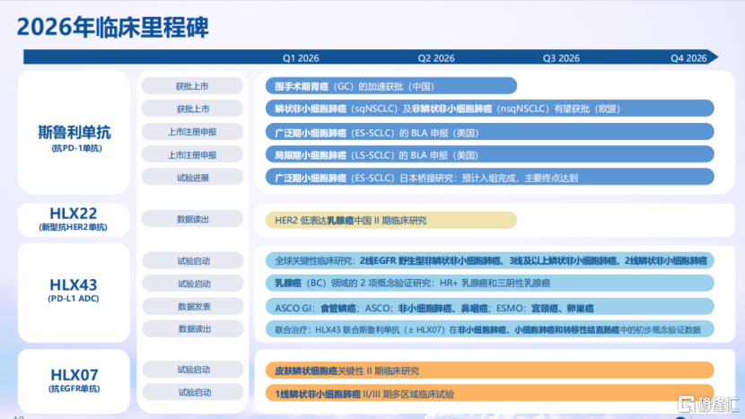 HLX43(PD-L1 ADC):作为国内首个进入临床的PD-L1 ADC,已获得FDA孤儿药资格,目前正在全球多国开展II期研究。公司计划在2026年底前启动三项全球关键临床研究(分别针对EGFR野生型非鳞状非小细胞肺癌二线治疗、鳞状非小细胞肺癌三线及后线治疗和二线治疗),并启动两项针对乳腺癌的概念验证研究。此外,其治疗食管鳞癌、非小细胞肺癌、鼻咽癌等多个癌种的临床数据也将在重要学术会议上陆续公布(食管鳞癌数据已于ASCO GI 2026公布),并计划完成与H药±HLX07联用的多项前瞻性概念验证研究数据读出。