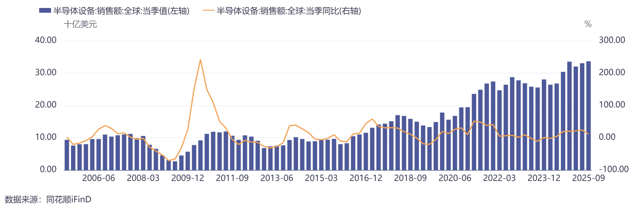 SEMI最新数据也显示,2025年第三季度全球半导体设备销售额同比增长11%,达到336.6亿美元,环比增2%。销售额增长主要得益于先进技术领域的强劲投资,特别是面向人工智能计算的高端逻辑芯片、DRAM及先进封装解决方案。