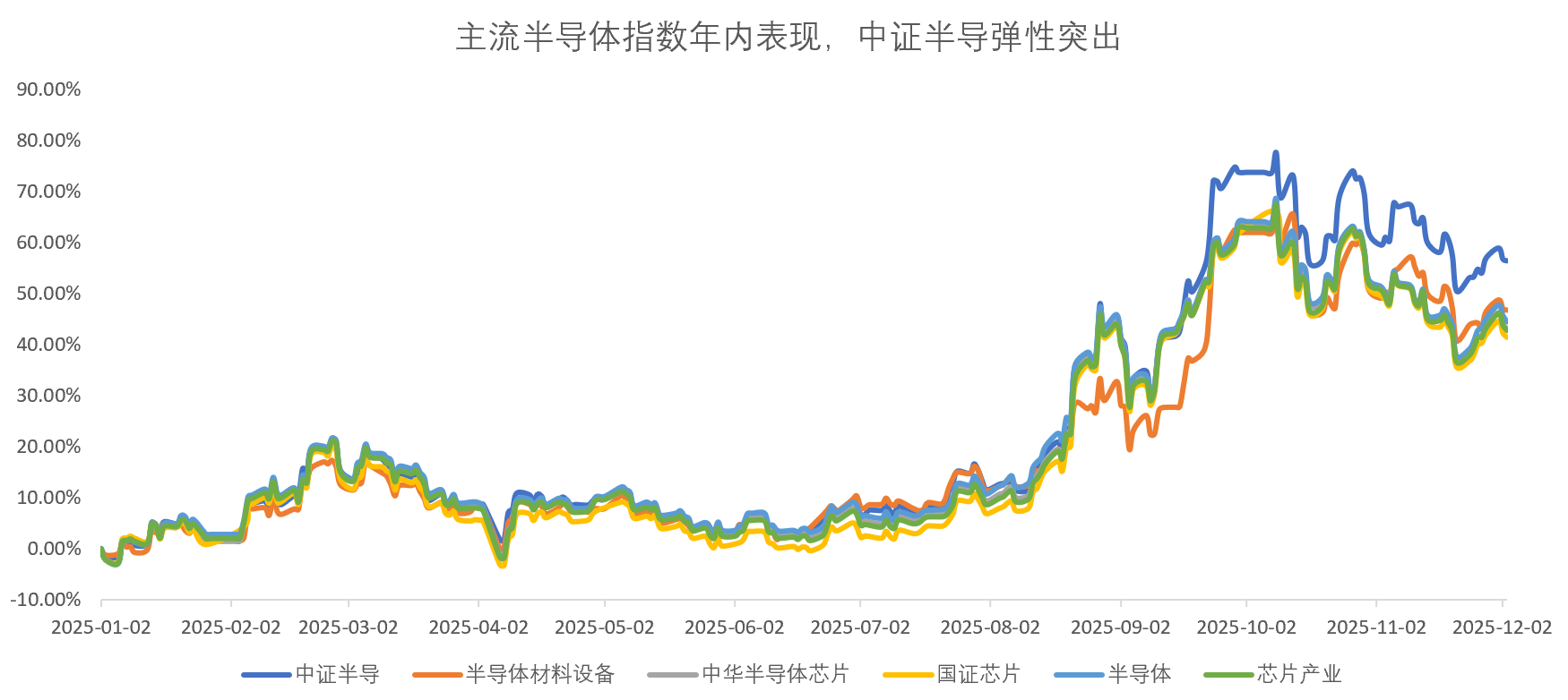 截至12月3日,中证半导2025年年内涨幅约50%,区间最大上涨超80%,在中证全指半导体、中华半导体芯片、国证芯片等主流半导体指数中位列第一,或在新一轮半导体周期中更具弹性。