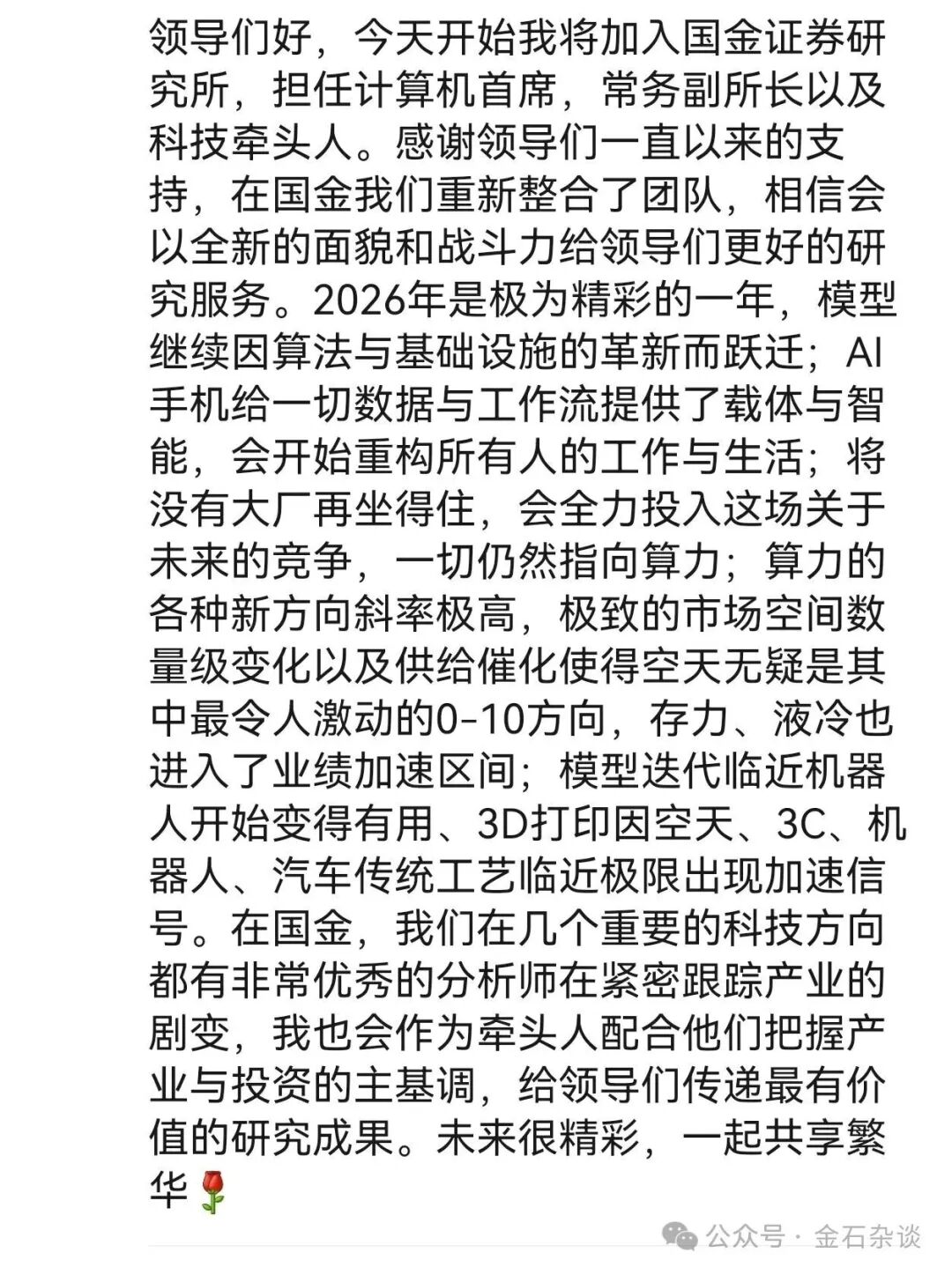 另有网传截图显示,刘高畅入职后将出任国金证券研究所常务副所长、计算机首席及科技牵头人。