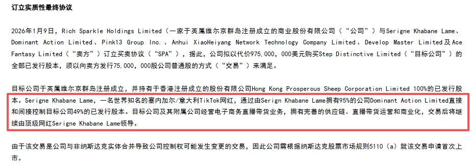 2026年1月,美股上市公司Rich Sparkle宣布完成对Step Distinctive的收购。该目标公司经营电子商务直播带货业务,由无语哥直接或间接持股49%,安徽小黑羊网络科技有限公司持股13%。天眼查信息显示,安徽小黑羊的控股股东为合肥领头羊文化传媒有限公司,该公司最终受益人系张庆杨、张开杨。