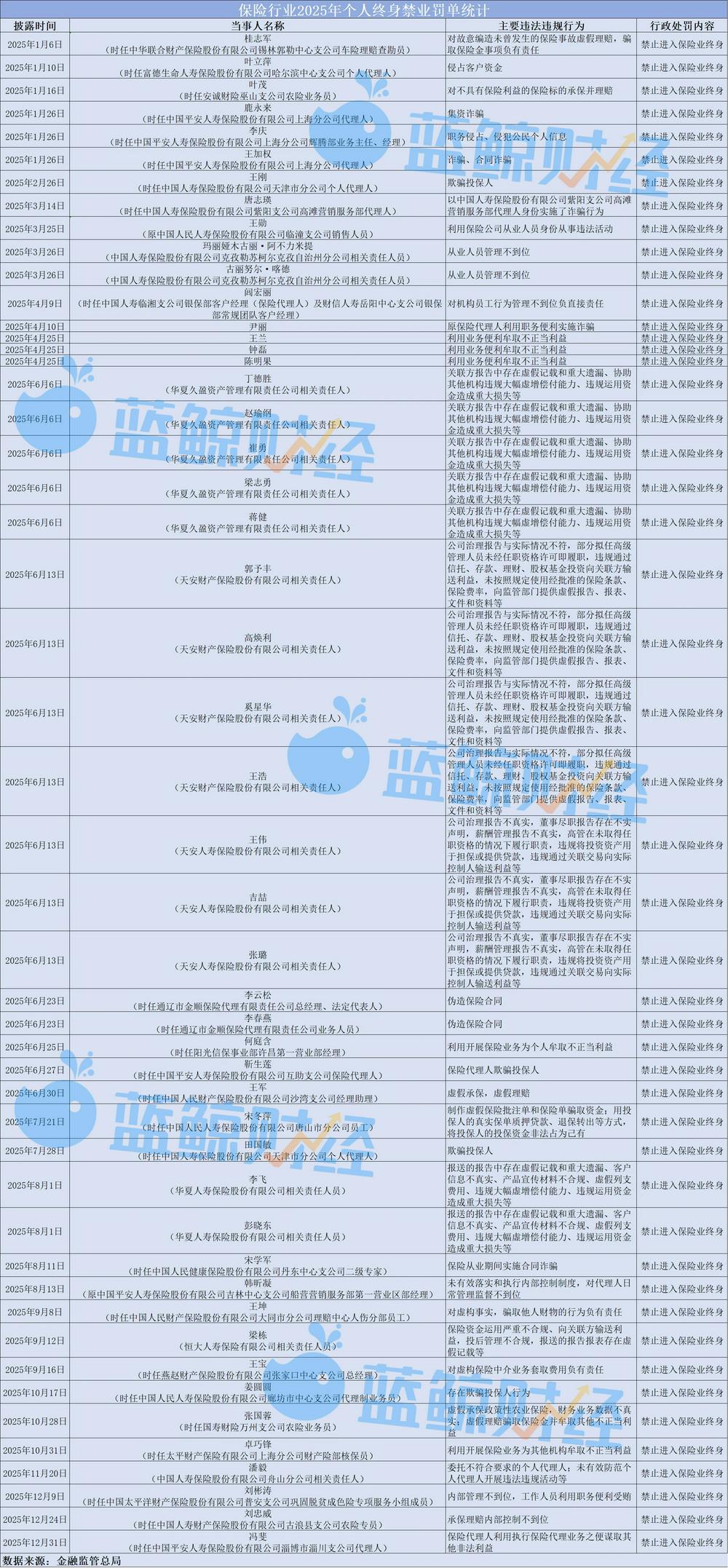 此外,伴随着监管问责机制的持续细化与强化,“双罚制”成为常态,个人处罚力度加码。记者梳理统计,年内约警告2268人次,罚款2239人次,处罚金额累计8376万元,取消任职资格共计21人次,禁止从事保险业共计119人次,其中49人被终身禁入保险行业,行业合规监管正迈向重质效、严问责阶段。
