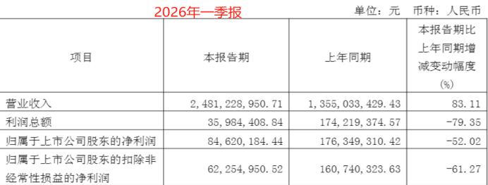 2026年第一季度,这一趋势加剧,营收同比增长83.11%至24.81亿,归母净利润却同比下滑52.02%,仅为0.84亿。