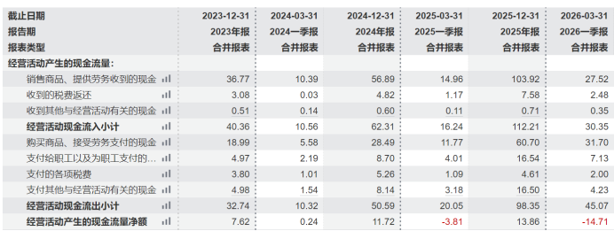 一个是现金流紧绷,按照公司当下三大新品初期的高额资金投入,单季度研发及销售投入高达9亿,2026年第一季度,公司经营活动现金流净额为-14.71亿,同比大幅恶化。加上战略性备料吞噬了大量现金,尽管2025年全年现金流仍为正,但季度性的“失血”表明其高速扩张模式对资金的消耗极大。