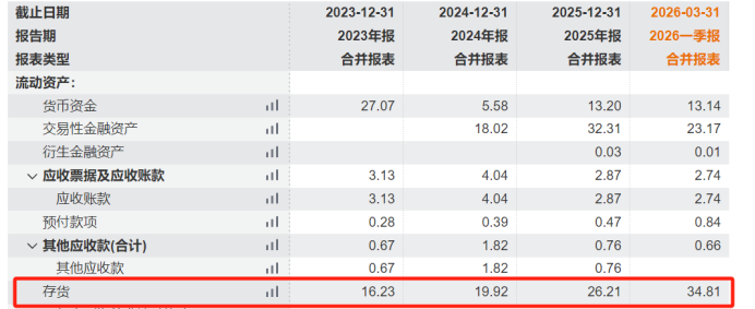 此外,为保障供应链和应对新品上市,公司存货账面价值从2025年初的10亿飙升至2026年一季度的37.94亿,存货资产占比从20%提高至34.8%。如此高的库存,面临激烈的市场竞争和行业景气度变化时,也潜藏着较大的资产减值风险。