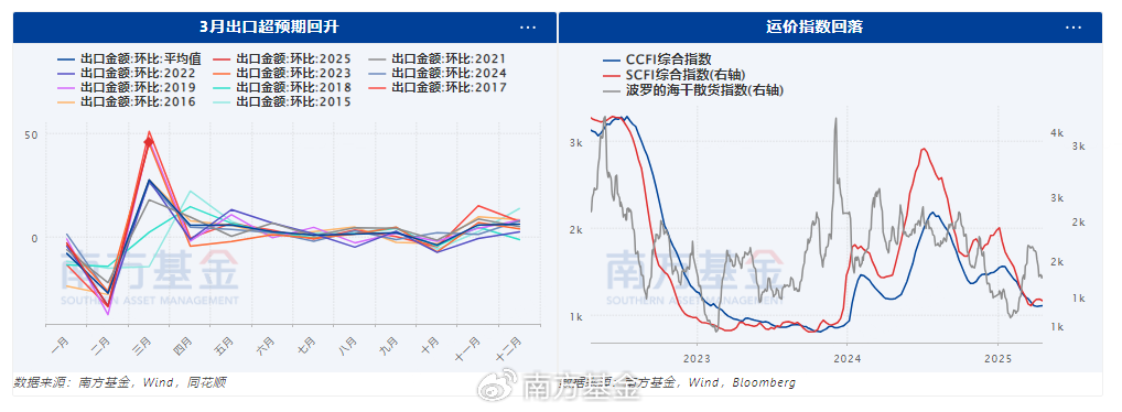 再看出口,3月出口超预期回升,主因低基数、季节性因素和强出口支撑,二季度出口或面临较大压力。一方面,伴随美国经济放缓,美国ISM制造业PMI和全球制造业PMI均回落至荣枯线以下;另一方面美国关税政策超预期落地,叠加二季度开始基数开始回升,出口压力或逐步加大。高频指标显示运价指数较年初已明显回落,干散货指数近期也下行,另一方面港口集装箱(货物)吞吐量开始回落。