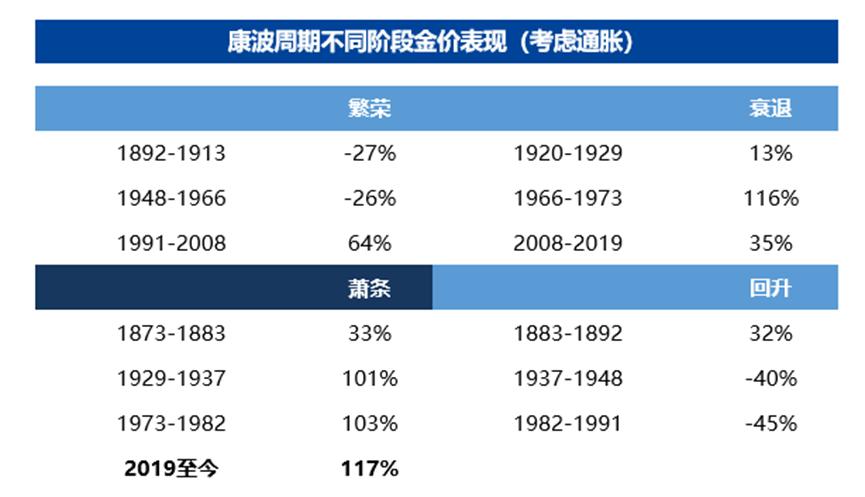 具体来看,1873-1883年的康波萧条期:黄金涨了33%;1929-1937年的康波萧条期:黄金涨了101%;1973-1982年康波萧条期:黄金涨了103%;回到当下这轮,2019年至今黄金已经涨了117%。