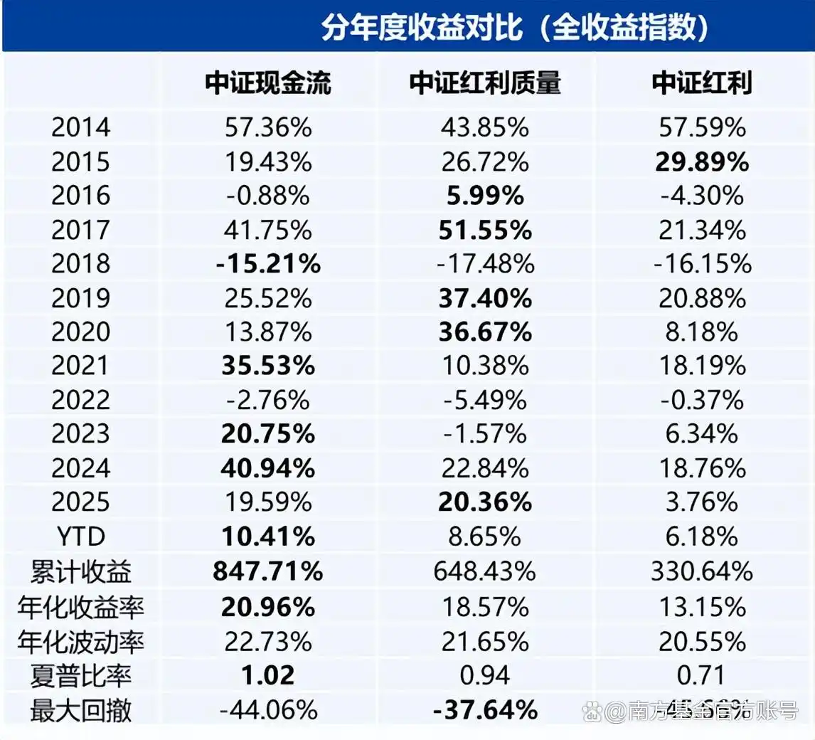 此外值得一提的是,相较于另外两大指数,中证现金流指数在2014-2025年的历年表现中,从未出现年度收益垫底的情况。